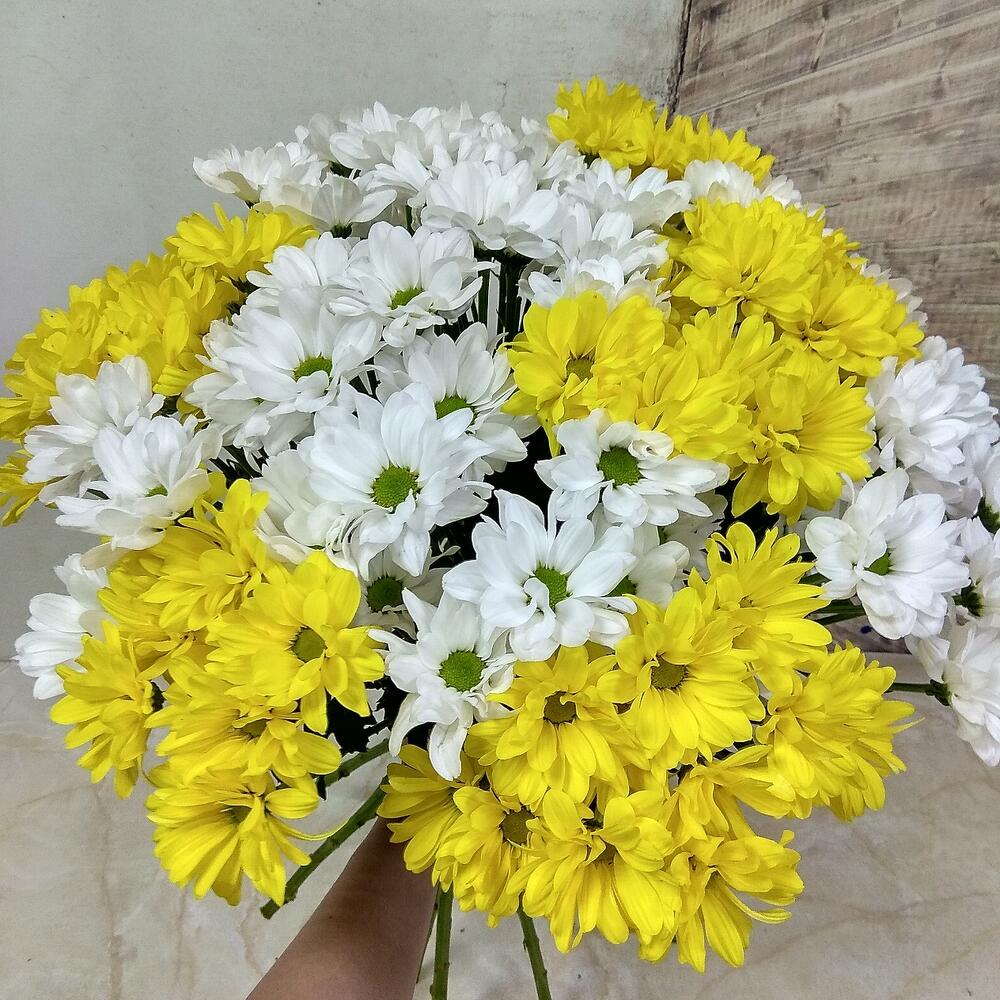 Хризантема кустовая – 15 шт.Рускус сочи – 8 шт.Лента атласная – 2 шт.