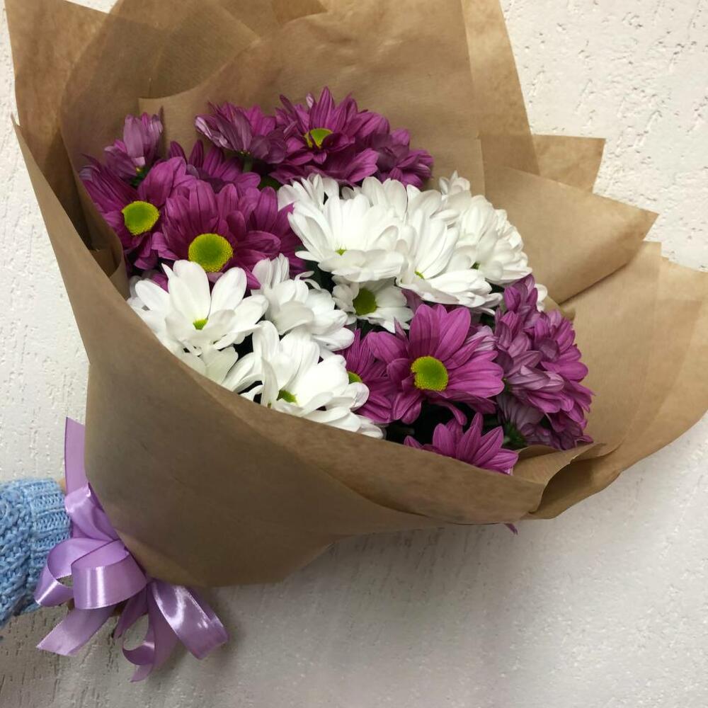 Хризантема кустовая белая – 2 шт.Хризантема кустовая розовая – 3 шт.крафтовая бумага – 2 шт.Лента атласная – 1 шт.