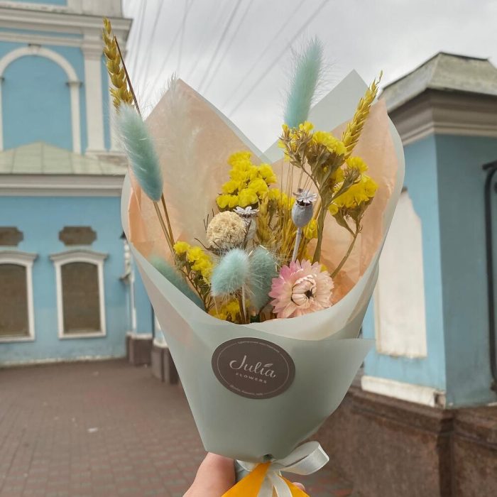 Скабиоза – 1 шт.Статица – 3 шт.Лагурус – 5 шт.Гелихризум – 1 шт.Пшеница (сухоцвет) – 2 шт.мак коробка – 2 шт.