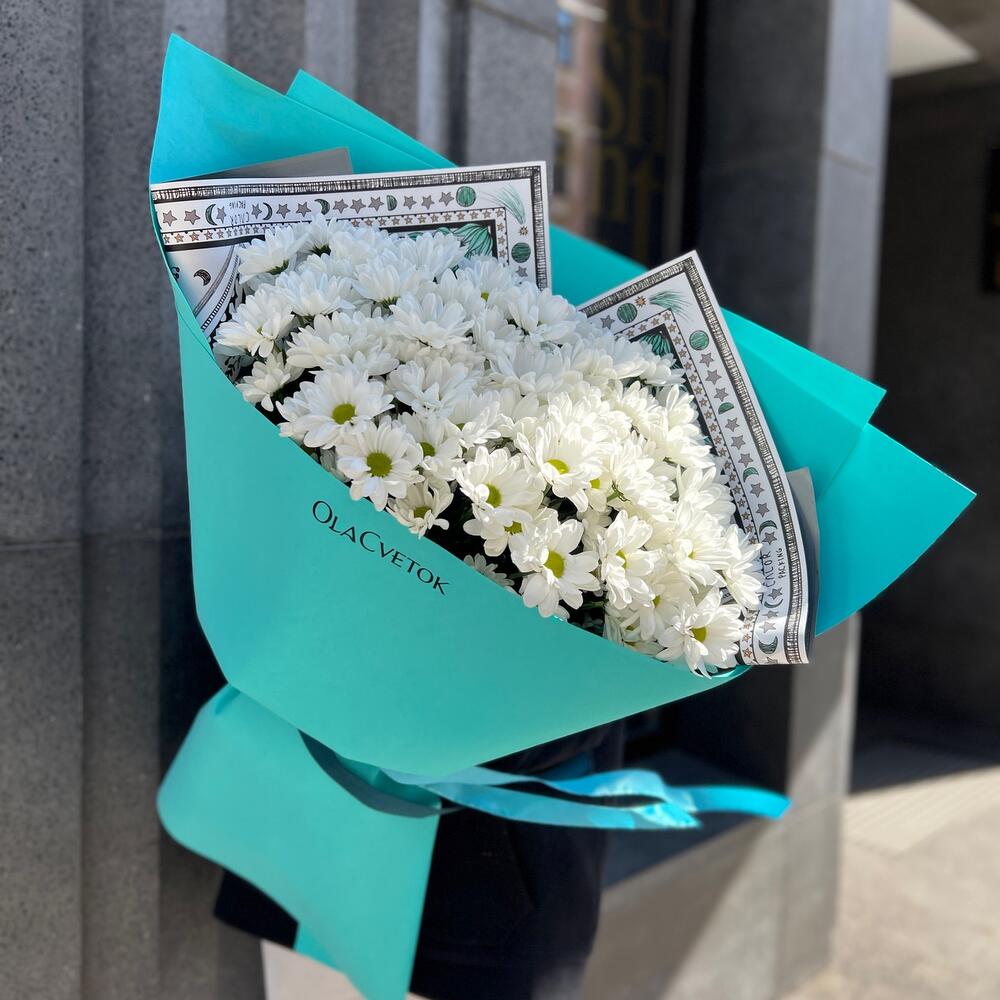 Хризантема кустовая – 13 шт.Лента атласная – 1 шт.Упаковка дизайнерская – 1 шт.