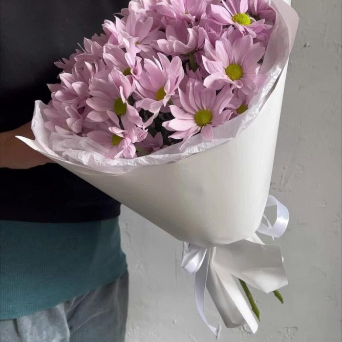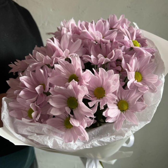 Кустовая хризантема – 5 шт.Лента атласная – 2 шт.Упаковка дизайнерская – 2 шт.