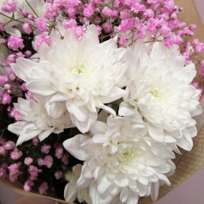 Хризантема кустовая – 3 шт.Упаковка – 1 шт.Лента атласная – 1 шт.Гипсофила розовая – 2 шт.