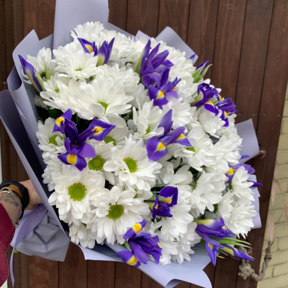 Хризантема кустовая – 7 шт.Ирис Blue Magic – 18 шт.Упаковка дизайнерская – 2 шт.Лента атласная – 2 шт.Фисташка – 5 шт.