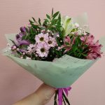 Букет с альстромериями, кустовой розой, гвоздикой и ваксфлауэром