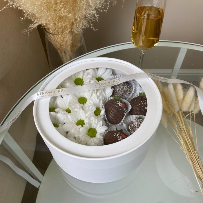 Милейший подарочный набор в круглой коробке с прозрачной крышкой хризантемы и клубники в молочном шоколаде, идеальный подарок, который никого не оставит равнодушным!Срок хранения клубники 24 часа при температуре от +2 до +8