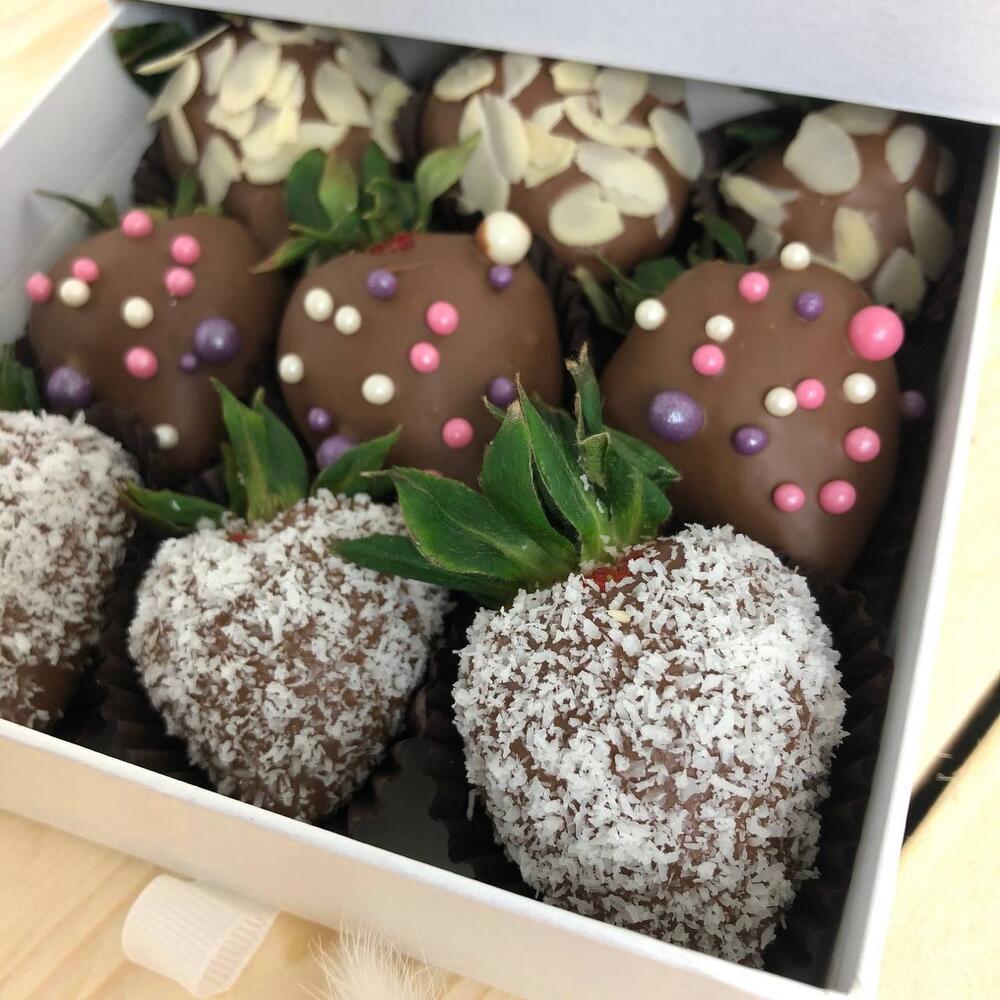 Подарочный набор в шкатулке с хризантемой и клубникой в молочном шоколаде