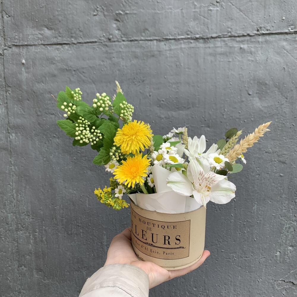 Альстромерия – 1 шт.Хризантема – 1 шт.Кашпо металлическое – 1 шт.Оазис флористический – 1 шт.Одуванчик – 2 шт.
