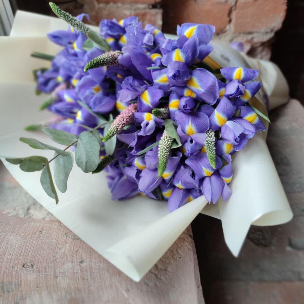 Ирис – 25 шт.Вероника – 9 шт.Эвкалипт – 1 шт.Упаковка – 1 шт.