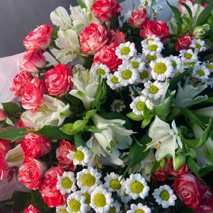 Альстромерии, Кустовые розы, Лизиантусы, Пионовидные розы, Розы, Ромашки