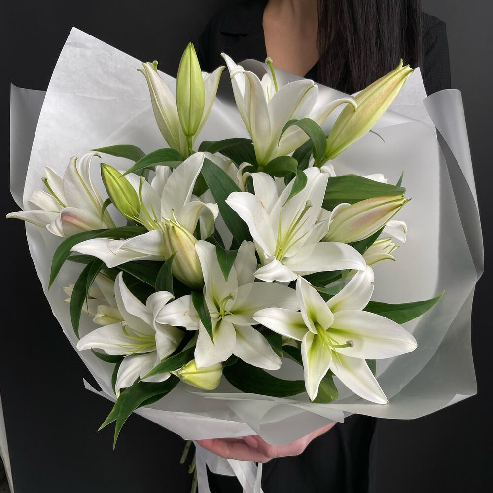 Лента атласная – 3 шт.Крафт белый – 2 шт.Пленка дизайнерская – 3 шт.лилия голландия белая – 5 шт.
