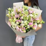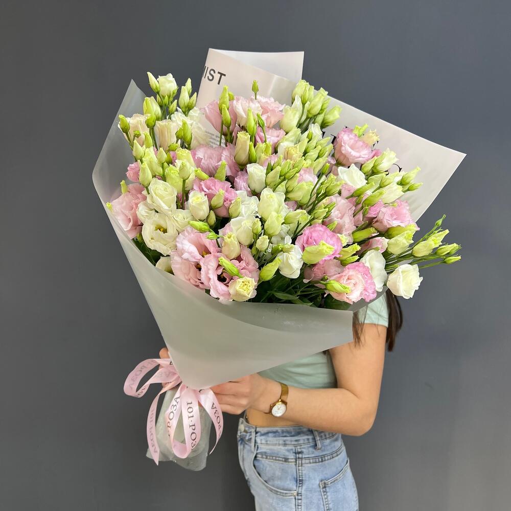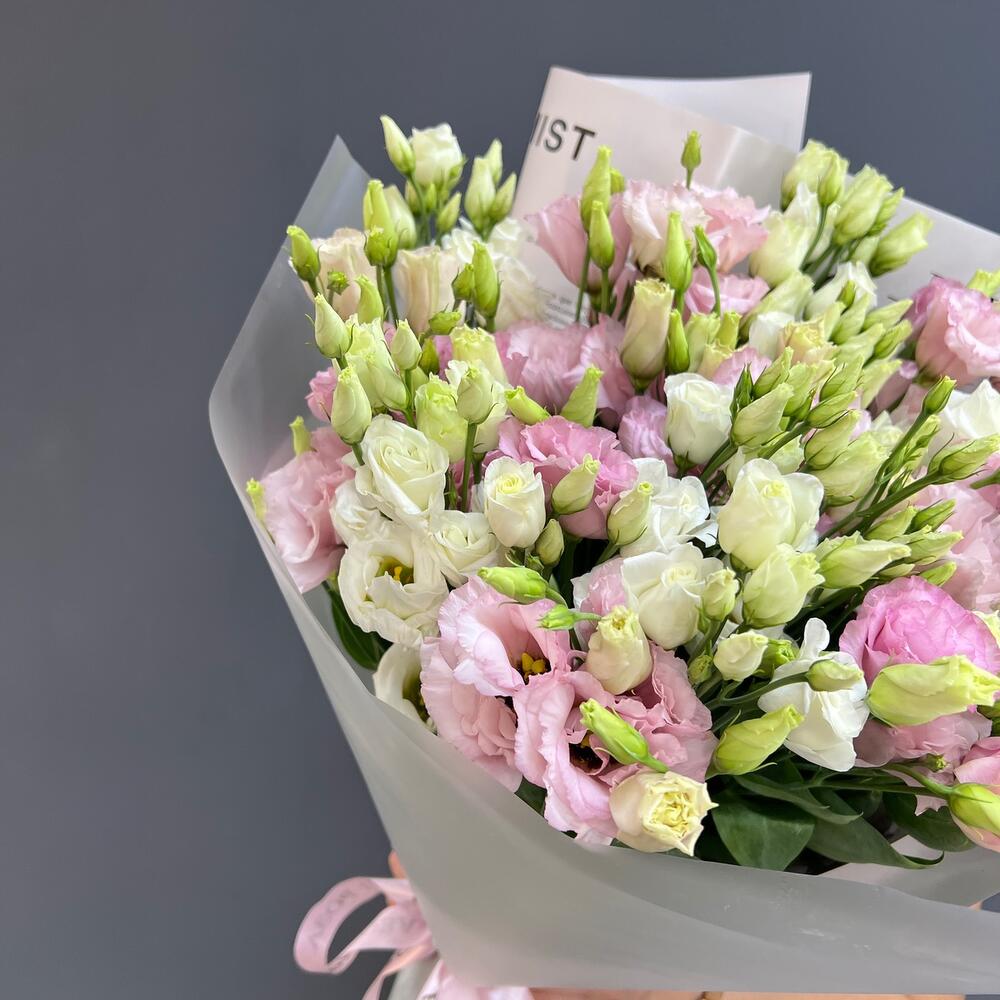 Эустома – 15 шт.Атласная лента – 1 шт.Дизайнерская упаковка – 1 шт.