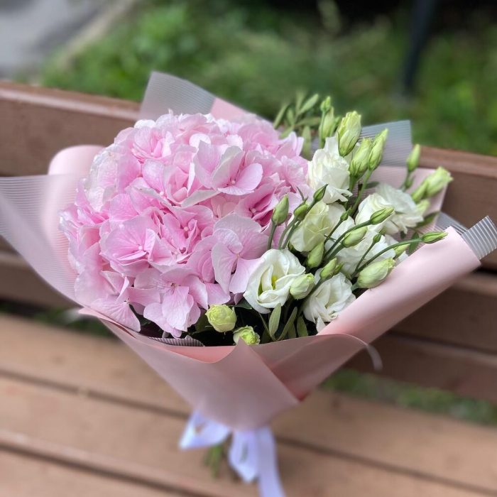 Гортензия розовая – 1 шт.эустома белая – 2 шт.фисташка зелень – 2 шт.