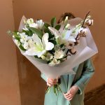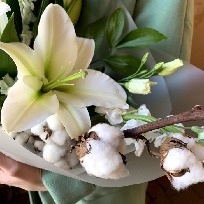 Альстромерия – 2 шт.Маттиола – 2 шт.Лилия белая – 1 шт.Лизиантус белый – 1 шт.Рускус сочи – 3 шт.Хлопок ветка – 1 шт.Авторская упаковка – 1 шт.