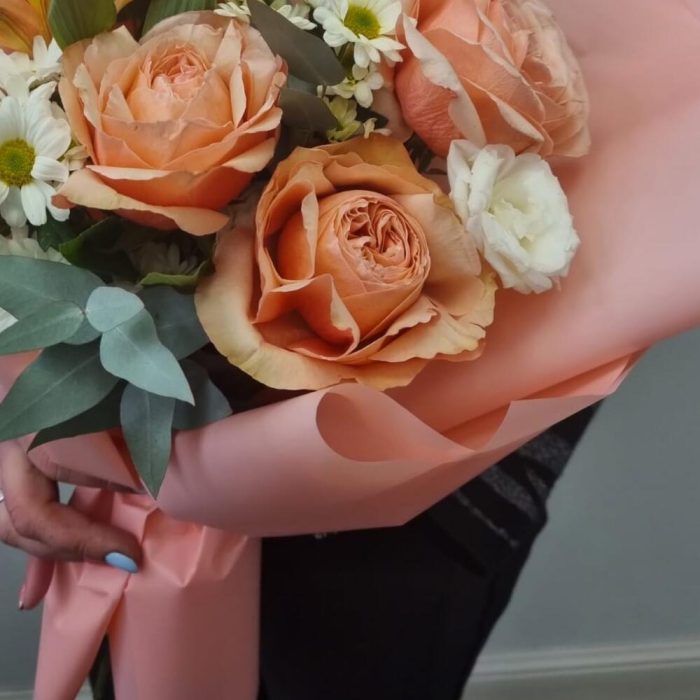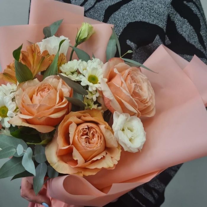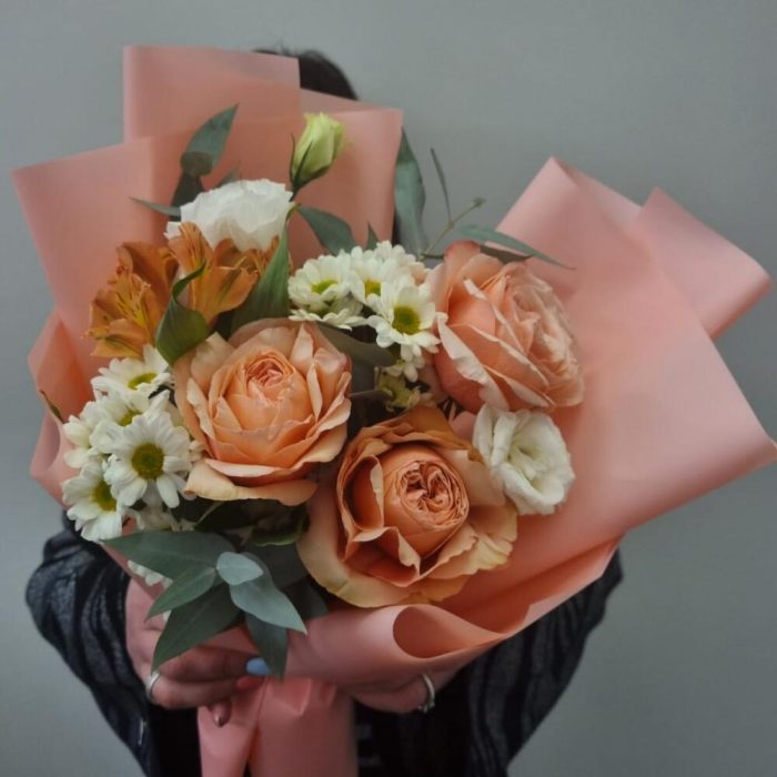 Нежный букет из розы, альстромерии, эустомы в стильной упаковке