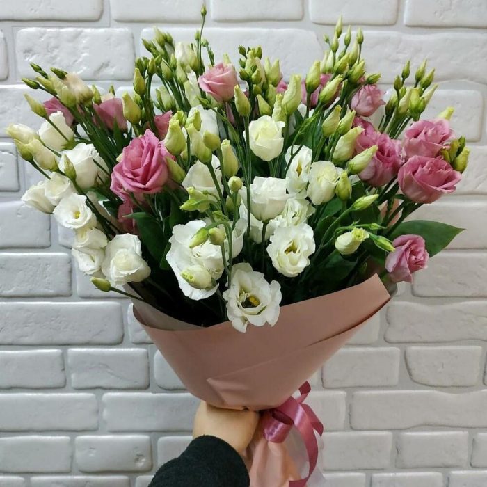 эустома белая – 9 шт. эустома розовая – 8 шт. оформление калька – 1 шт.