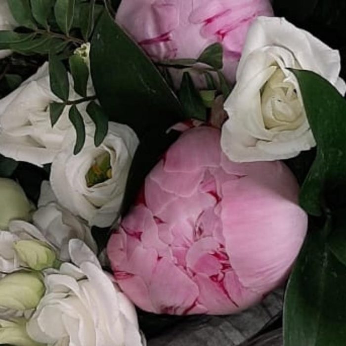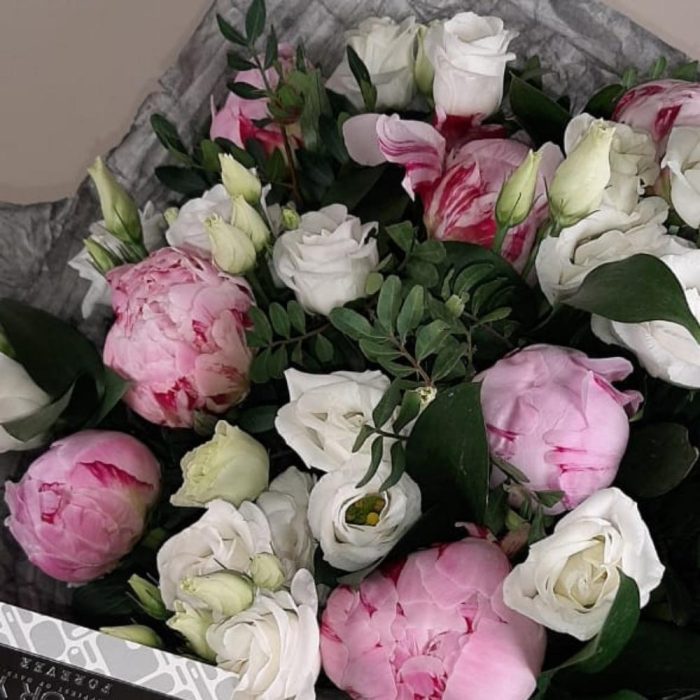 Пион Сара Бернар – 7 шт.эустома белая – 7 шт.Писташ – 5 шт.
