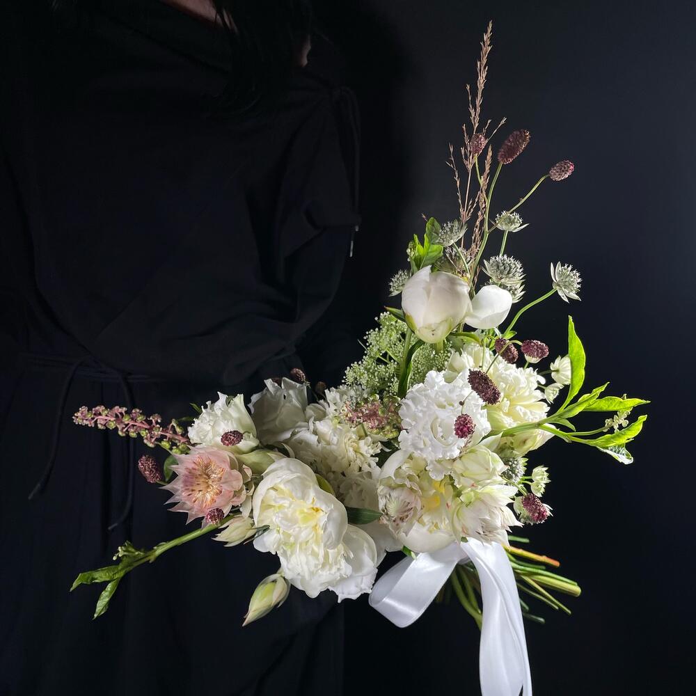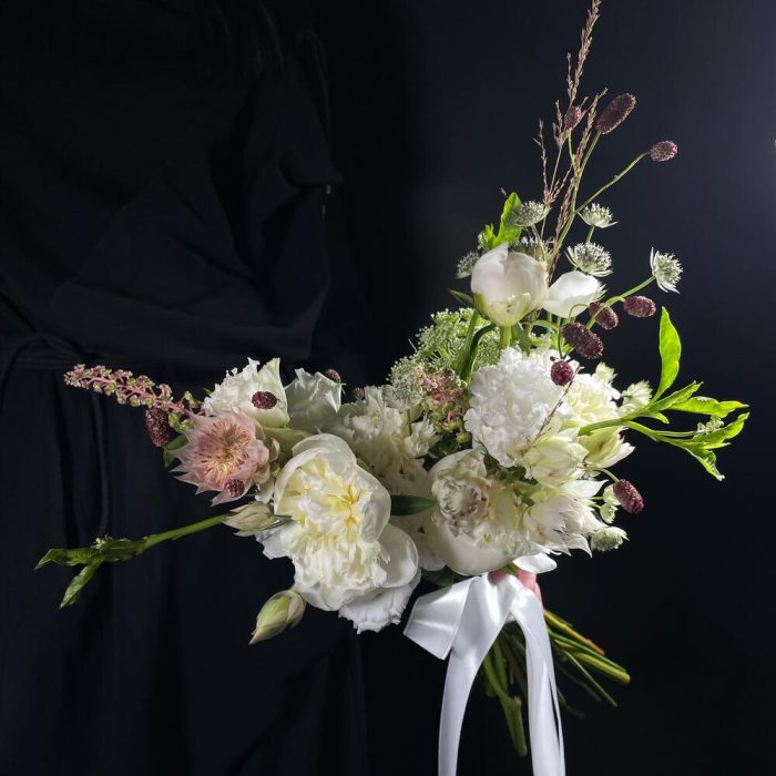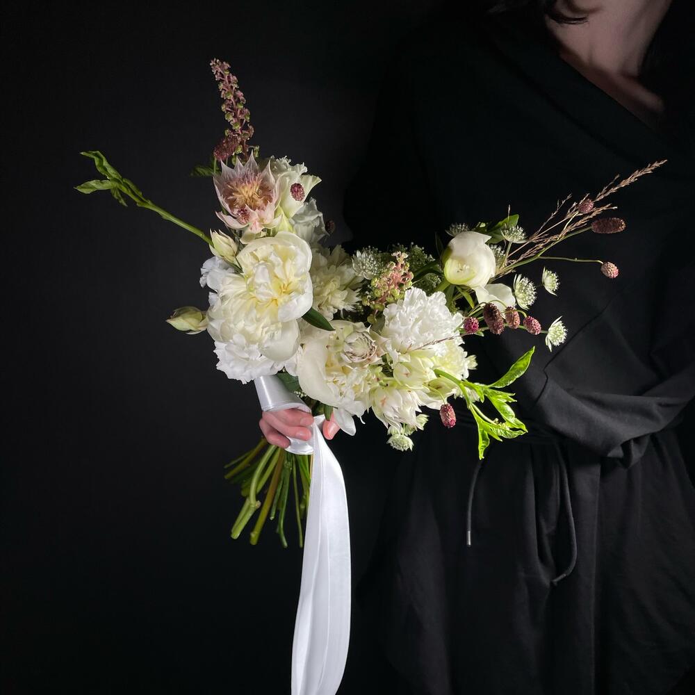 Букетик из пионовидных роз Охара, лизиантусов и озотамнуса