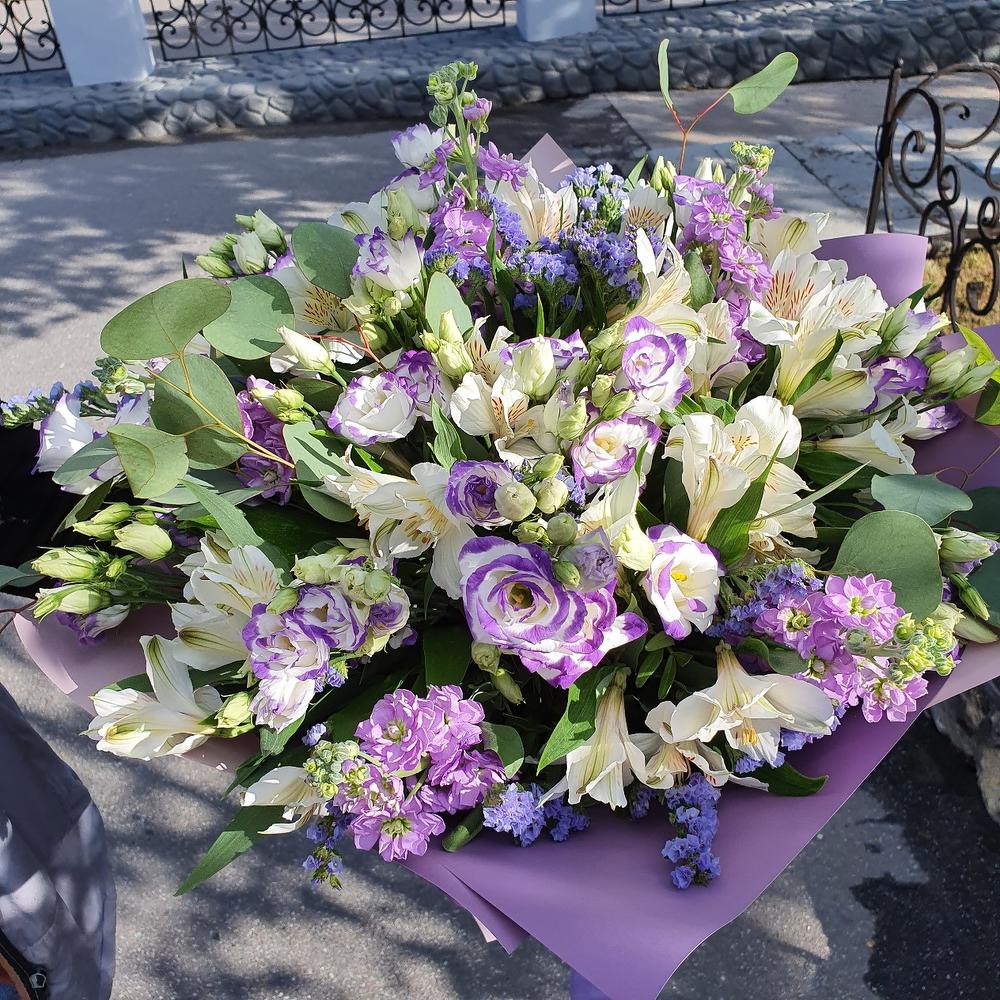 Лизиантус – 11 шт.Альстромерия – 9 шт.Маттиола – 5 шт.Статица – 3 шт.Эвкалипт – 5 шт.Фисташка – 5 шт.Зелень – 5 шт.Упаковка дизайнерская – 3 шт.