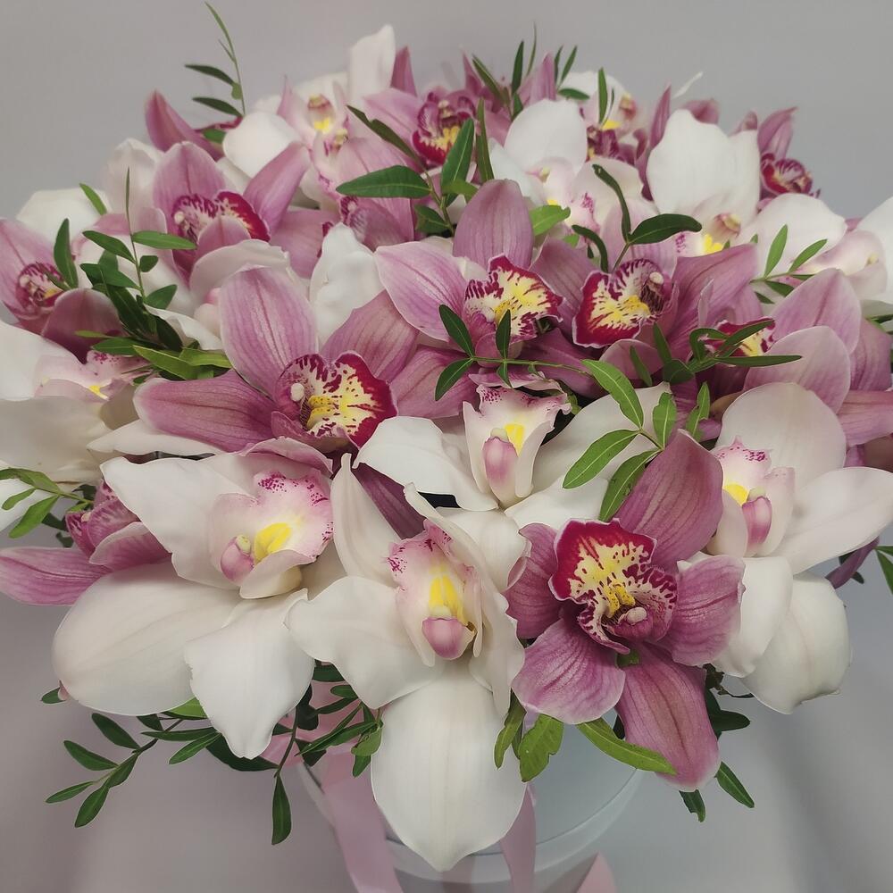 Орхидея Цимбидиум ветка – 2 шт.Коробка шляпная – 1 шт.Фисташка пучок – 1 шт.Оазис флористический – 2 шт.бант атласный – 1 шт.