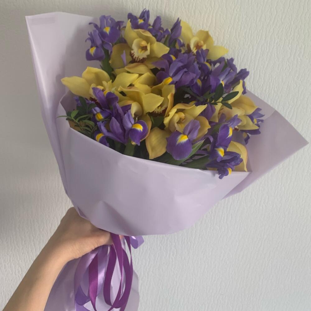 Орхидея и ирисы яркий букет