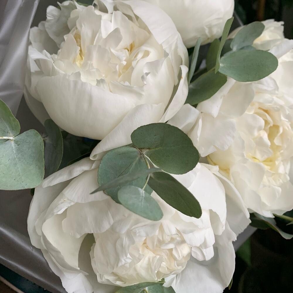 5 белоснежных пионов с эвкалиптом