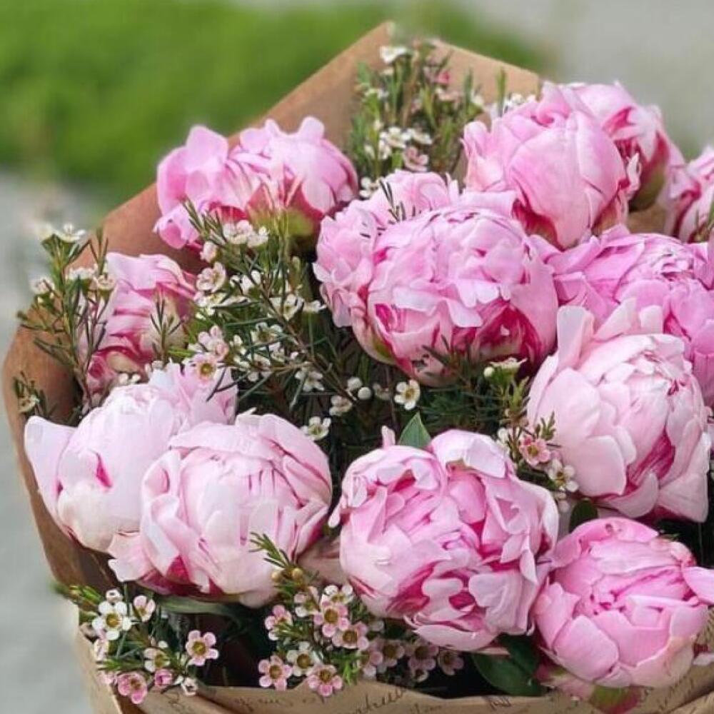Букет из 15 пионов с хамелациумом
