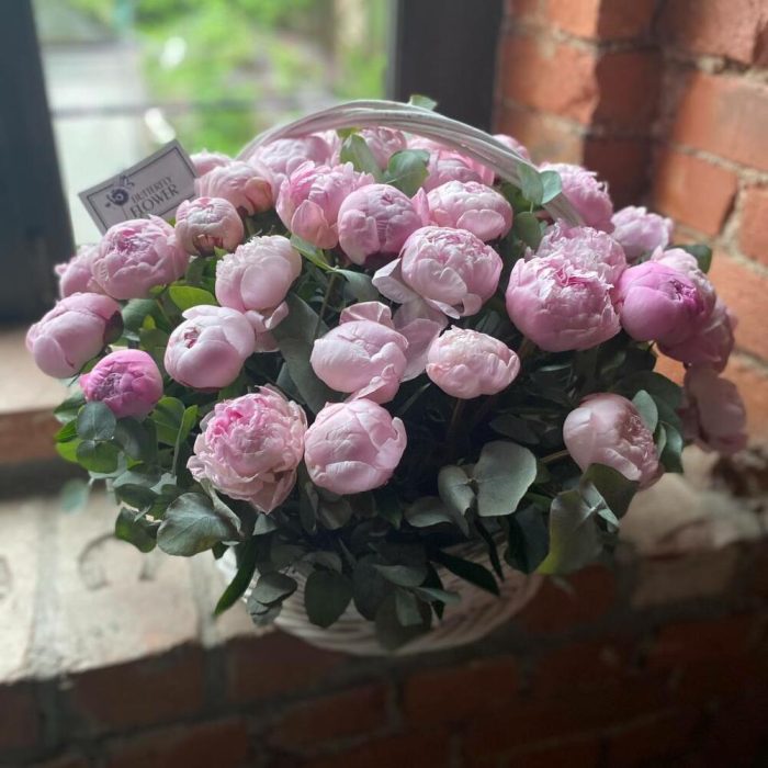 Букет из 51 розового пиона и эвкалипта в корзине “Фестива Максима”