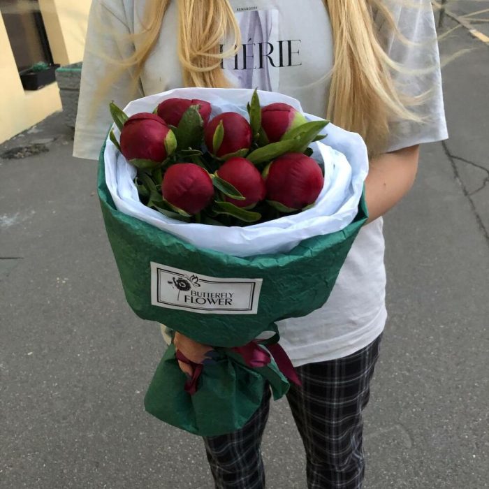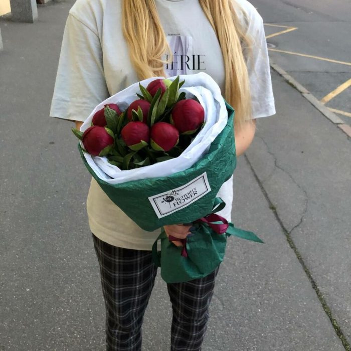 Букет из 7 бордовых пионов в дизайнерской упаковке “Лючия Грация”
