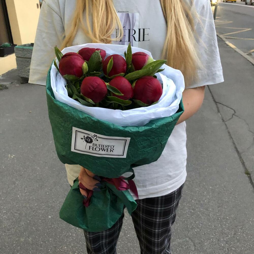 Букет из 7 бордовых пионов в дизайнерской упаковке "Лючия Грация"