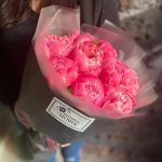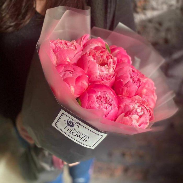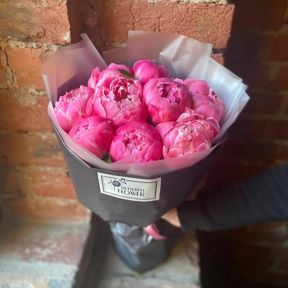Букет из 9 ярко-розовых пионов в дизайнерской упаковке “Корал Шарм”