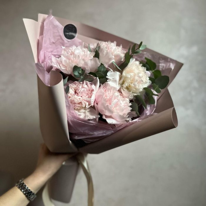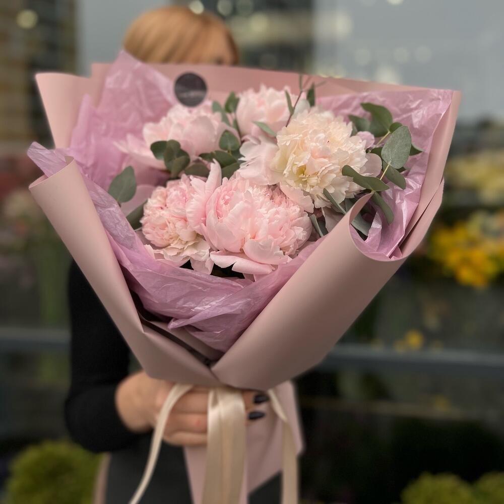 Атласная лента – 1 шт.декоративная упаковка – 1 шт.пионы – 5 шт.Эвкалипт – 3 шт.