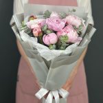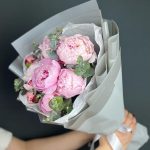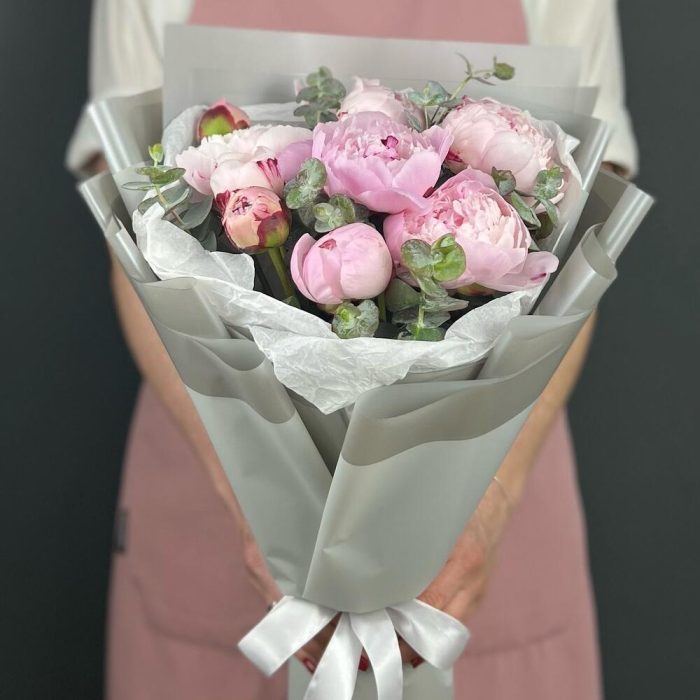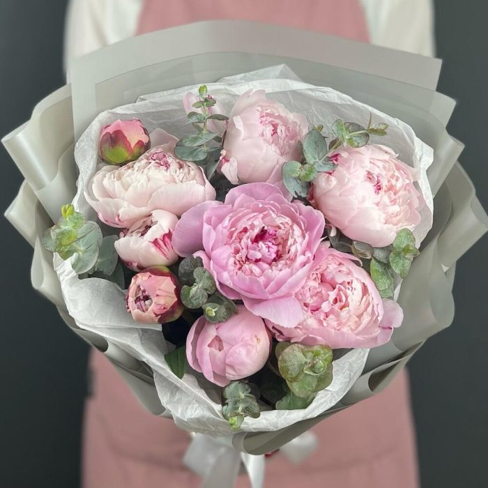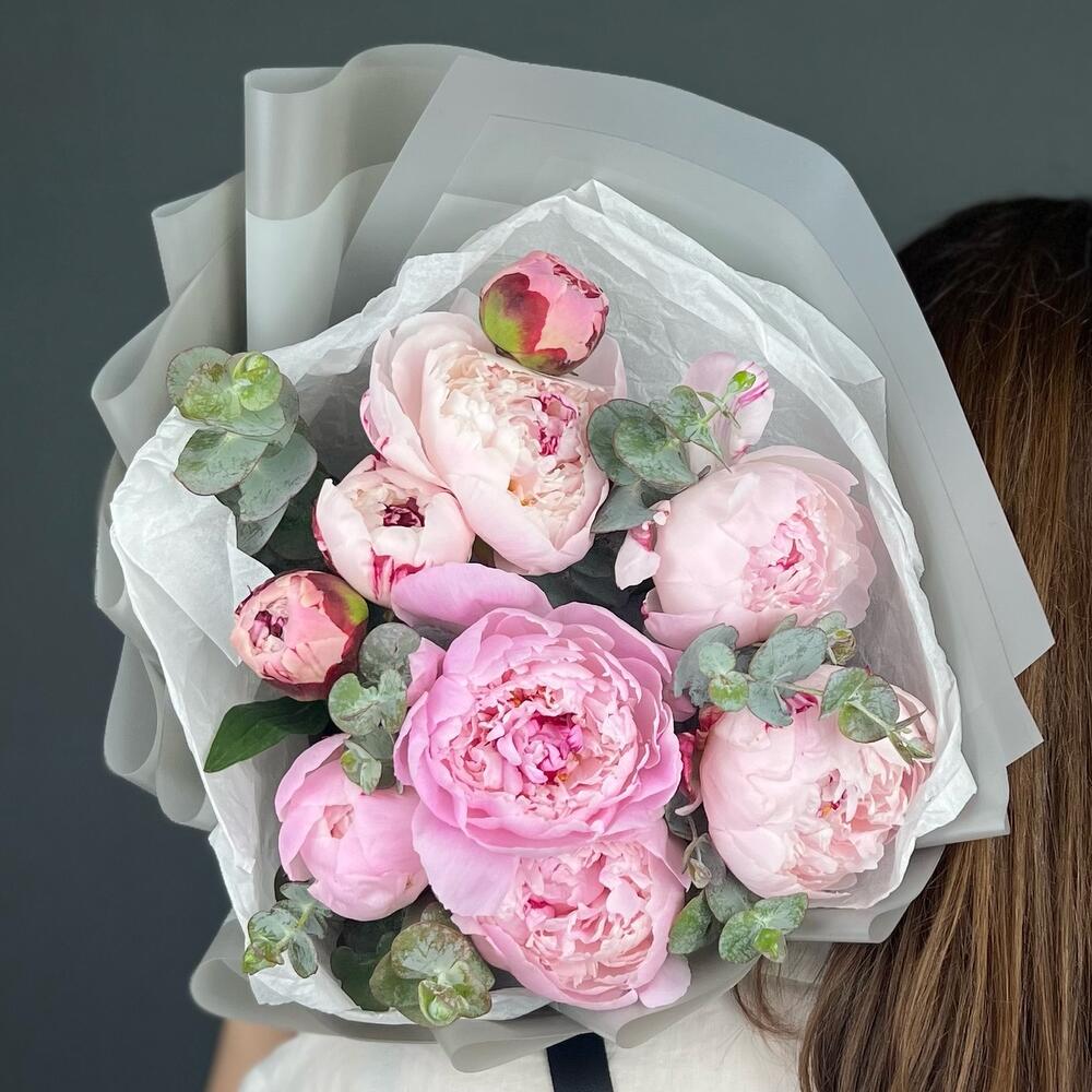 Пион – 9 шт.Эвкалипт – 3 шт.Лента атласная – 1 шт.Бумага тишью – 1 шт.бумага дизайнерская – 5 шт.