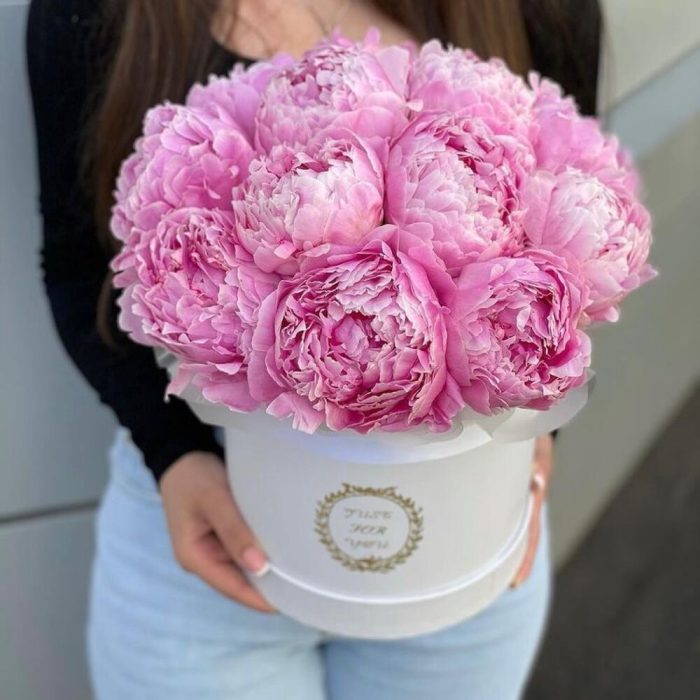 Цветы в большой коробке: садовые розы, лизиантус, маттиола, тюльпаны
