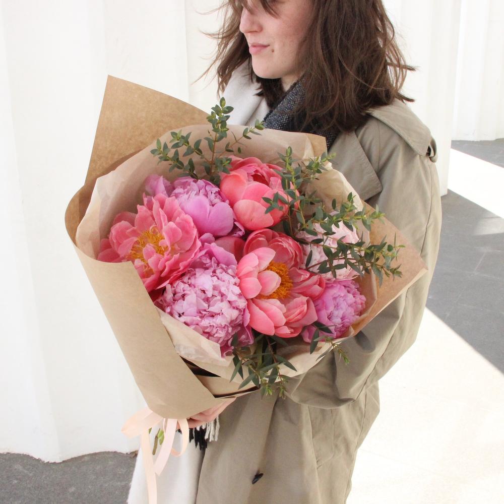Лента – 1 шт.Пион – 7 шт.Эвкалипт – 3 шт.Тишью – 1 шт.Упаковка крафт – 2 шт.