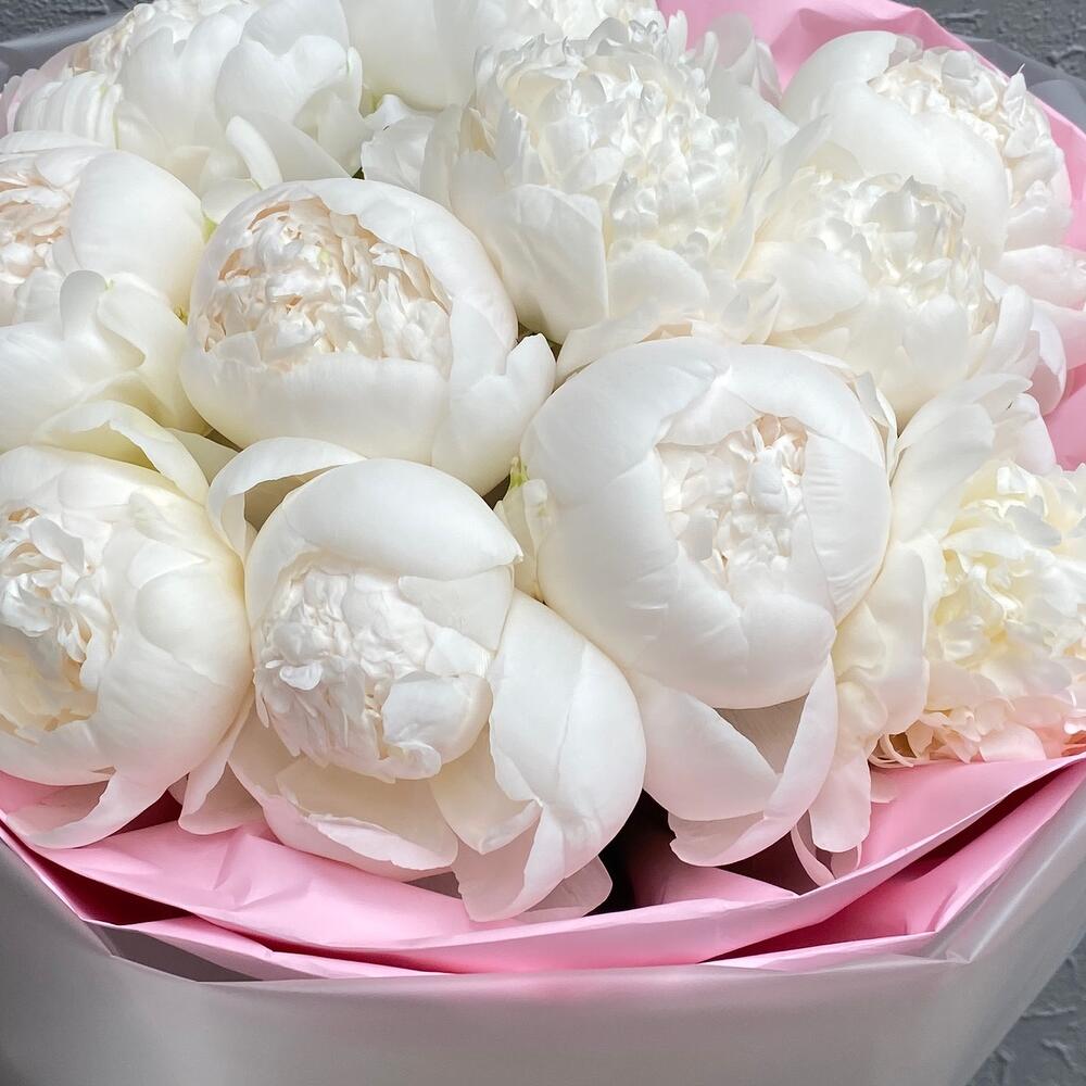 Лента атласная – 1 шт.Упаковка дизайнерская – 2 шт.инструкция по уходу за цветами – 1 шт.пион белый премиум – 11 шт.
