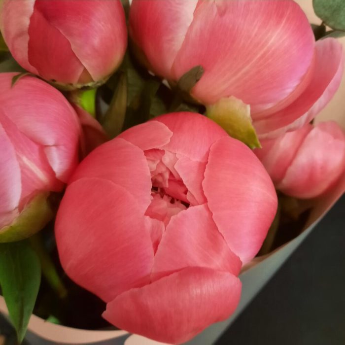 Пион Коралл Шарм (Coral Charm) – 7 шт.Эвкалипт – 1 шт.Упаковка дизайнерская – 1 шт.