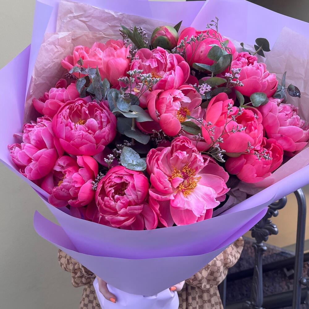 ПРЕМИУМ ШАРМ огромный букет из 15 пионов с эвкалиптом и лимониумом