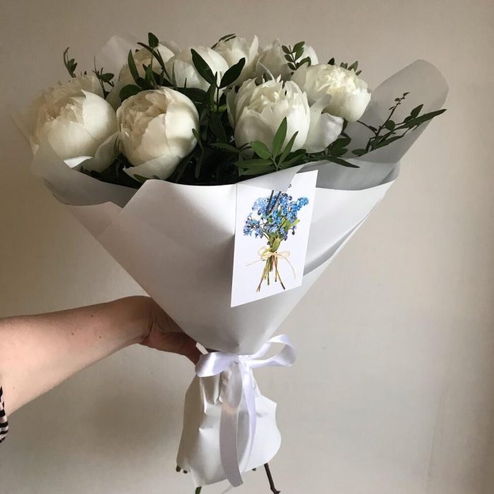 Лента – 2 шт.Зелень – 8 шт.Пион белый – 9 шт.Упаковка дизайнерская – 4 шт.