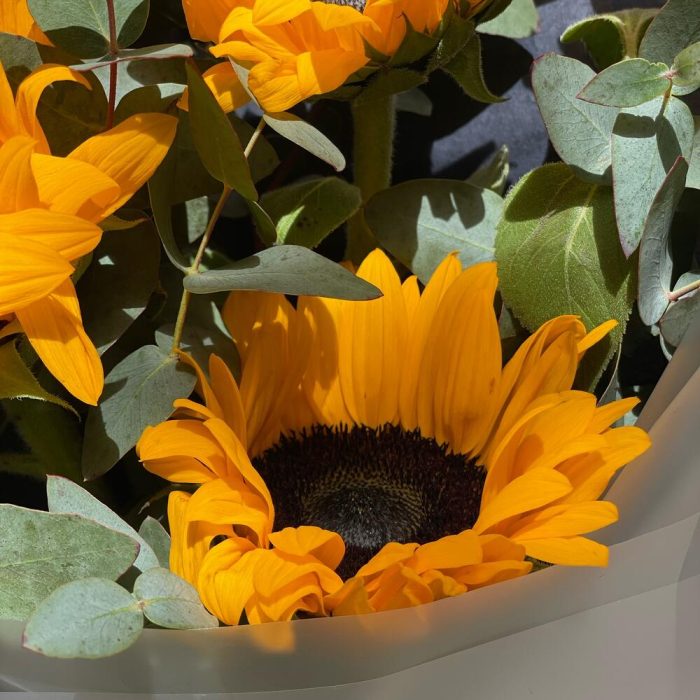 Эвкалипт – 2 шт.Лента атласная – 1 шт.Тишью – 2 шт.Подсолнух – 5 шт.Пленка матовая – 1 шт.