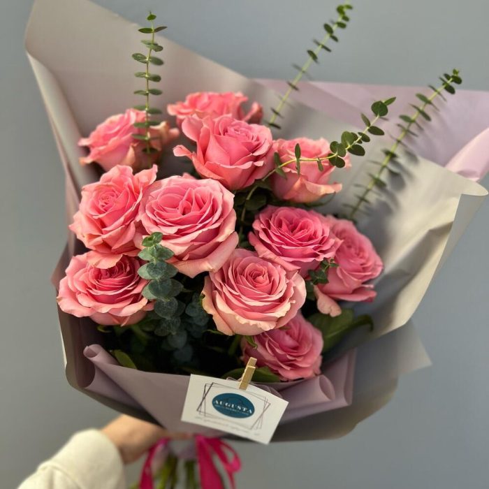 Роза Эквадор – 11 шт.Эвкалипт – 1 шт.Упаковка дизайнерская – 1 шт.Лента атласная – 1 шт.