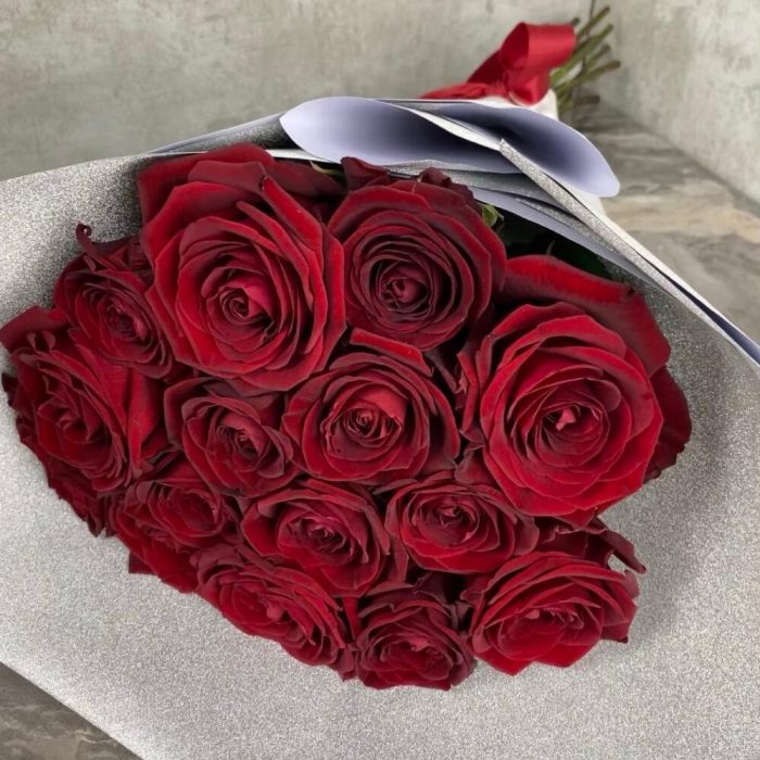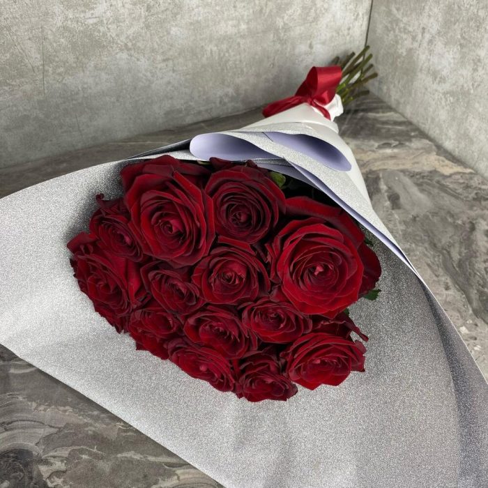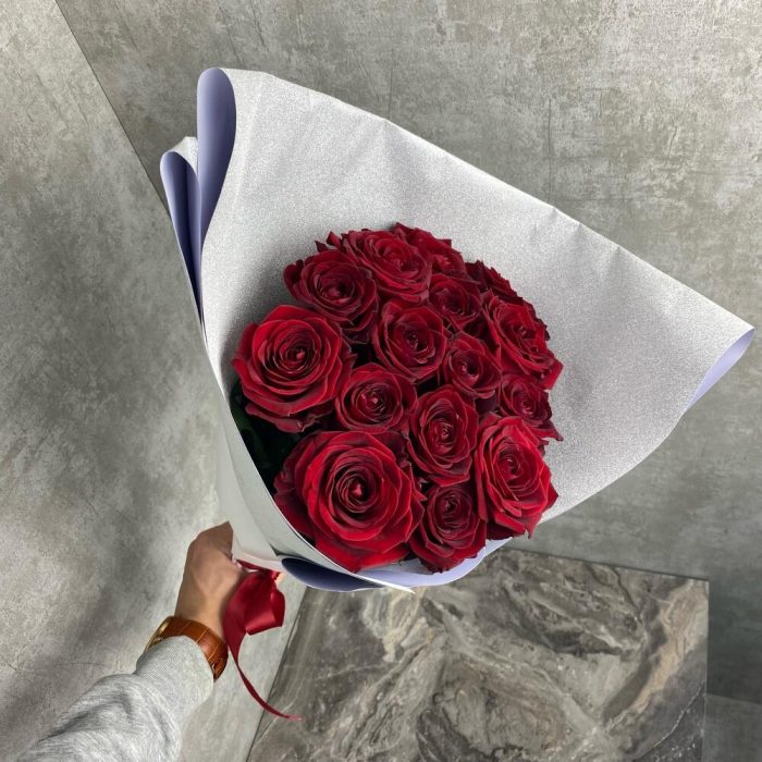 15 красных роз в блестящей упаковке
