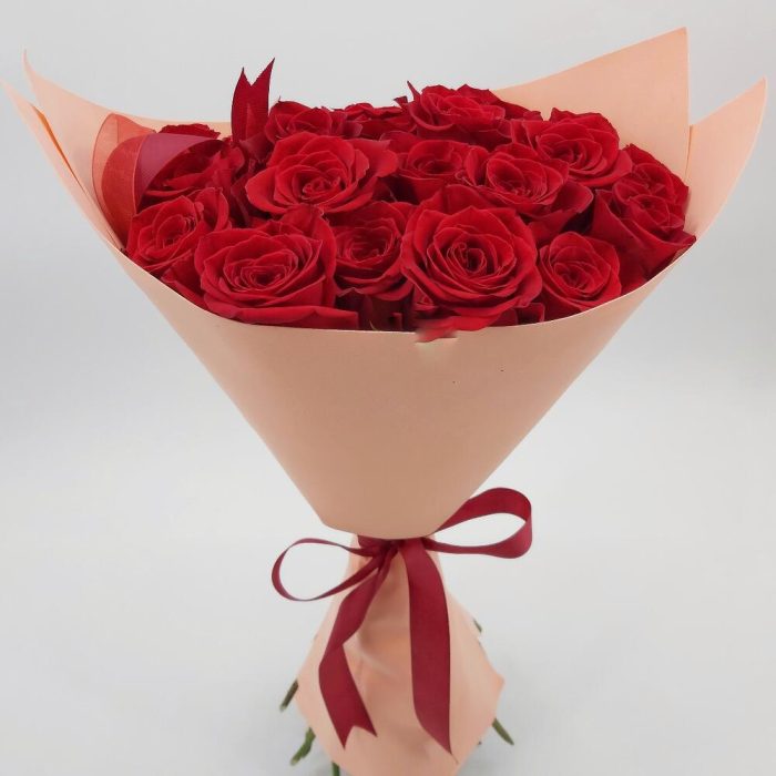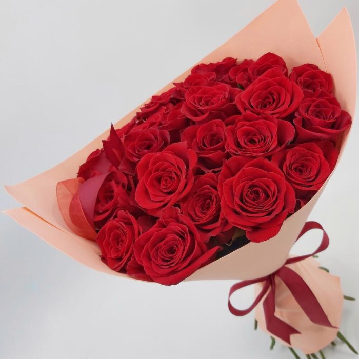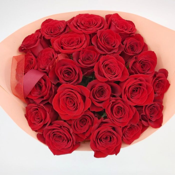 Стильный монобукет из 25 красных роз с оформлением – это классика, которая будет по нраву каждой девушке.
