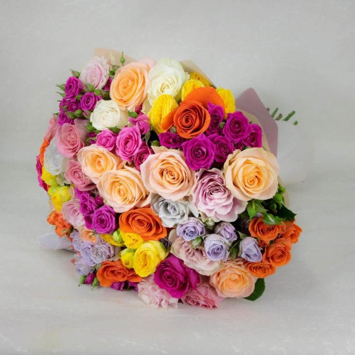 purple rose – 3 шт. purple spray rose – 4 шт. yellow spray rose – 3 шт. orange rose – 3 шт. orange spray rose – 3 шт. light orange rose – 5 шт. Pink rose – 5 шт. White rose – 2 шт. grey rose – 2 шт.