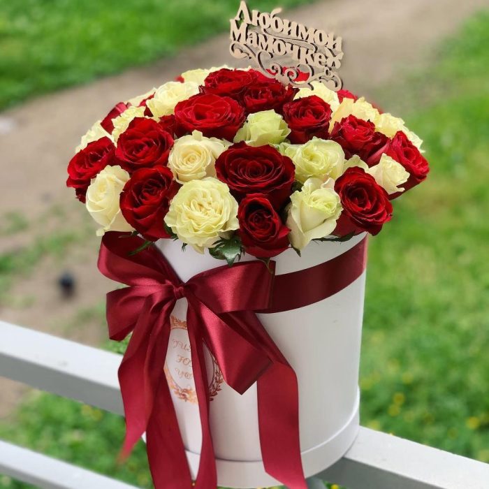 Роза – 39 шт.Коробка – 1 шт.Топпер – 1 шт.Оазис флористический – 1 шт.