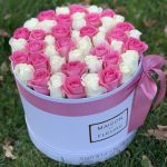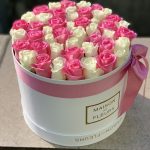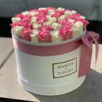 Роза розовая – 25 шт. Роза белая – 20 шт. Коробка круглая – 1 шт.