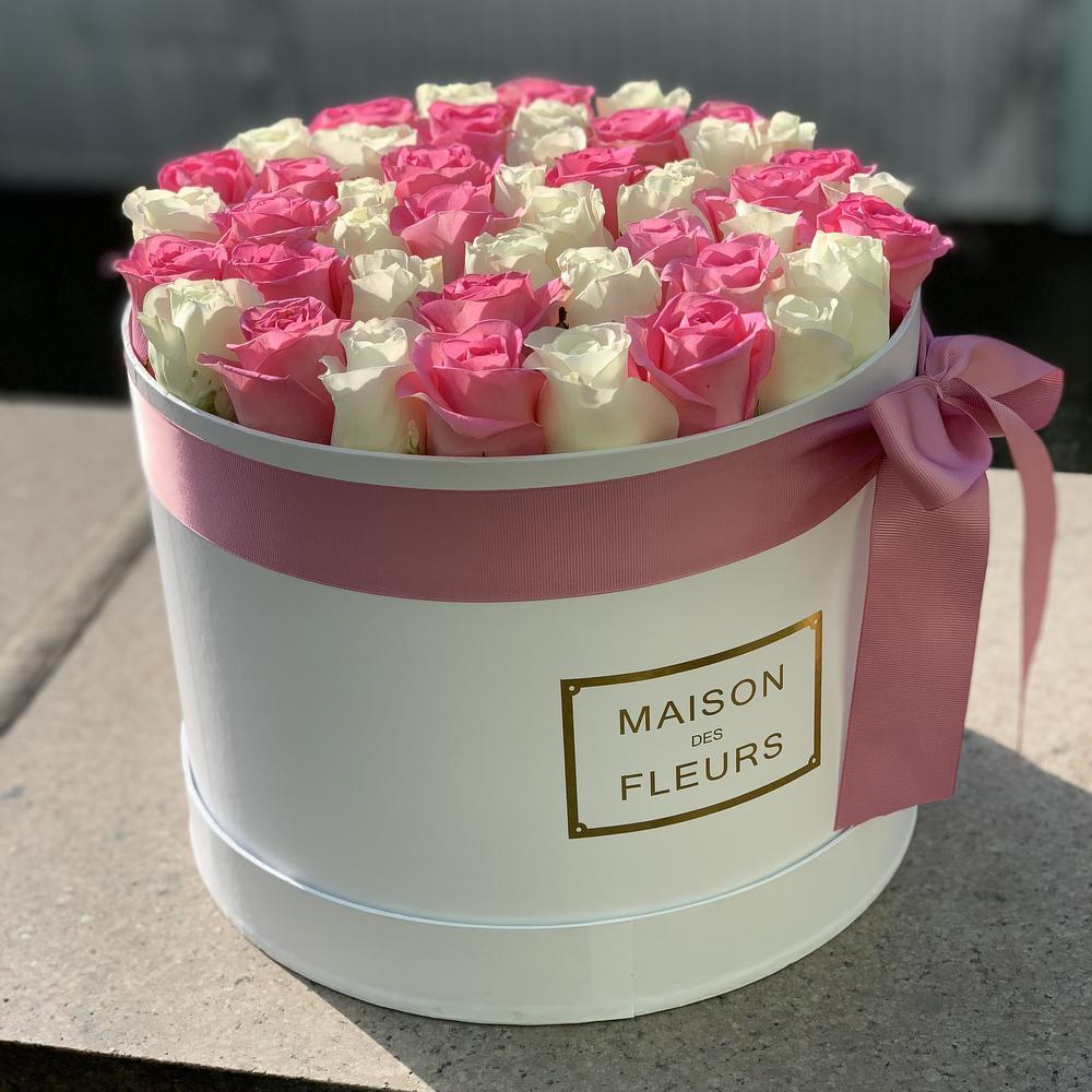 45 роз розовых и белых в коробке