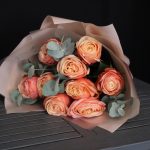 Роза пионовидная кахала – 9 шт.Эвкалипт – 3 шт.Пленка матовая – 4 шт.Лента атласная – 2 шт.