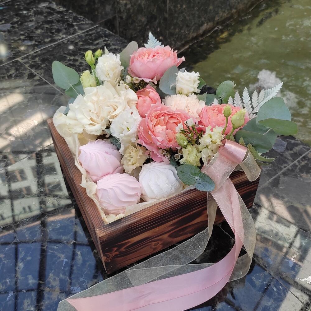 "Атлас☁️" - цветочная композиция с зефиром в деревянном ящике