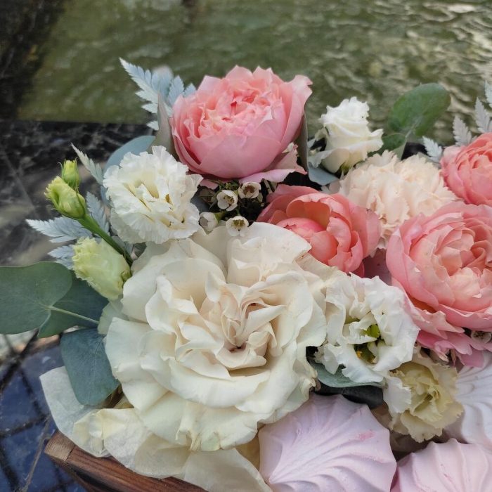“Атлас☁️” – цветочная композиция с зефиром в деревянном ящике