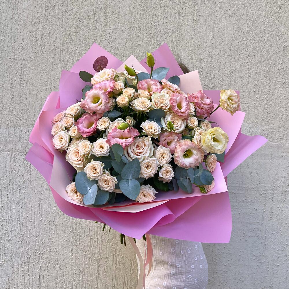 Роза кустовая – 10 шт. Эвкалипт – 5 шт. Роза – 7 шт. Упаковка – 1 шт. Эустома – 5 шт. Лента атласная – 1 шт.